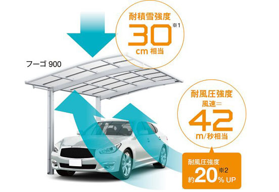 雪にも強いカーポートが守ってくれるから安心。「フーゴ900」なら、30cm相当の積雪から大事な車を守ります。