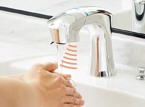 触れずに差し出すだけで湯水がでるから、掃除もラクラク、いつも清潔です。