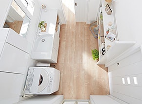洗面、洗濯、脱衣、様々なシーンで使うスペースだから、かならず導線の工夫をしましょう。例えばキッチンで食事の支度をしながら、お洗濯、お風呂掃除、お湯張りをするのに行き来しやすい導線でしょうか。